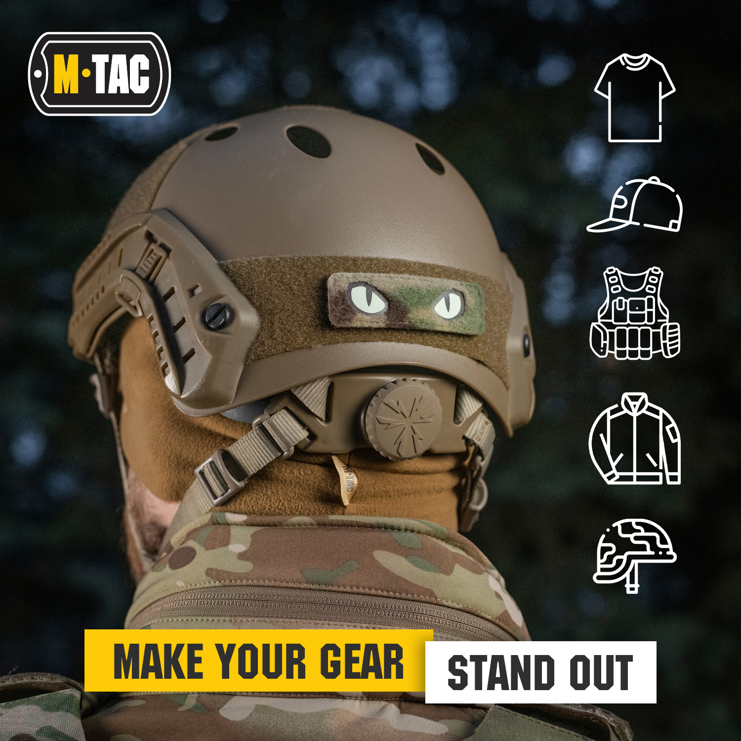 The M-Tac Cat Eyes Patch is an original morale patch that will personalize your gear. The patch depicts the cat's eyes, which are made using Laser-Cut technology. Also due to the light-accumulating elements, they glow in the dark and attract attention. This model is made with hook fastener and is attached to clothes, bags, backpacks, or other equipment with loop panel. The Cat Eyes patch will be a bright and original addition to your look.