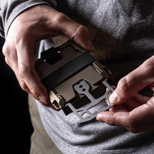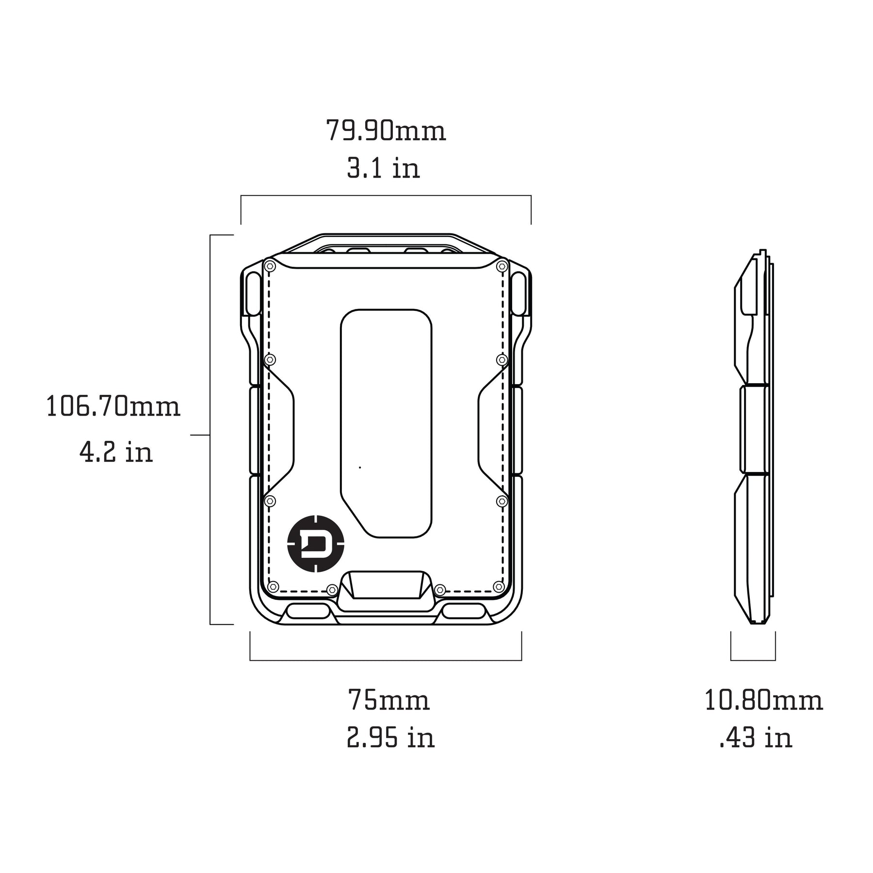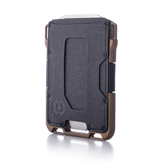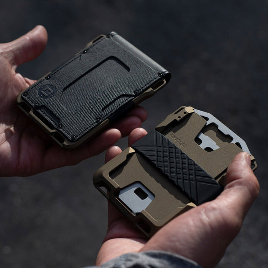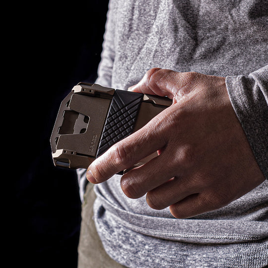 The M1 Spec-Ops combines CNC Machined 6061 aerospace aluminum with our very own developed DTEX material; a fine mixture of an industrial “bullet-proof” chassis with a wallet skin that is resilient, flexible and water resistant. The surface of the M1 chassis is ceramic coated with Cerakote - a firearms industry standard ceramic paint tough enough to withstand rough handling. The metal RFID blocking card cavity can hold up to 6 cards depending on card thicknesses.