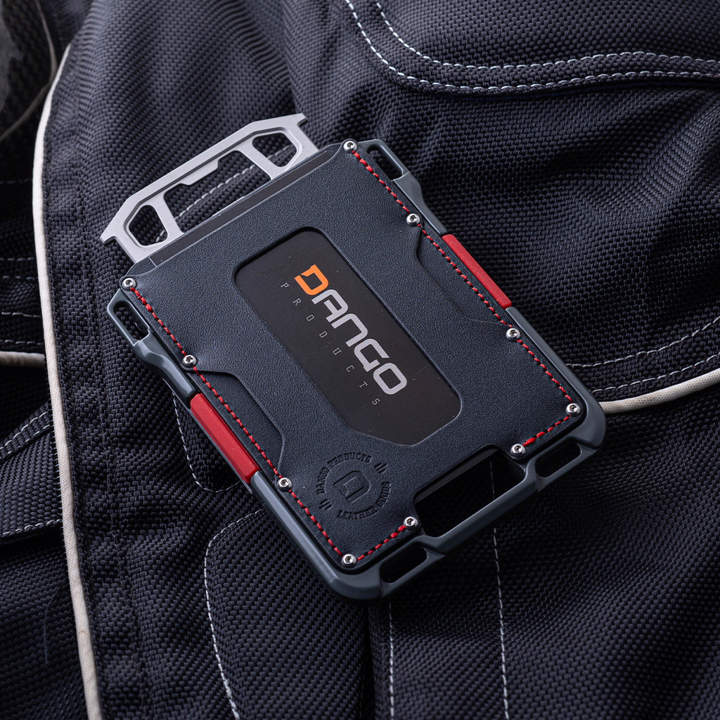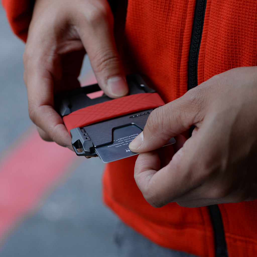 The M1 Maverick Wallet is a vertical wallet that deploys cards in portrait position as opposed to landscape. It combines CNC machined and anodized 6061 aerospace aluminum with top grain leather; a fine mixture of industrial hardware and plush elegance. The chassis has 4 loop holes incorporated into each corner to attach keys, lanyards and Tethers for both lefties and righties. The surface of the M1 chassis is anodized slate grey and assembled with red stitched rawhide leather. The metal RFID blocking card cavity can hold up to 6 cards depending on card thicknesses.