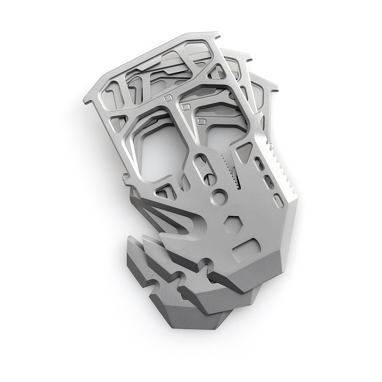The MT04 Multi-Tool made of high carbon, heat treated stainless steel. It has over 10 functions that are specifically designed to respond to emergency situations. The functions of the multi-tool include: a seat belt cutter, serrated/sharpened edges, chisel, 2 paracord tensioners, an O2 oxygen wrench, nail pryer, standard 1/4” inch hex wrench, and of course, a bottle opener. The MT04 Multi-Tool slides into the metal cavity of the M1 series wallets, where cards sit on top of and is nested securely onto the safety locks on the chassis.