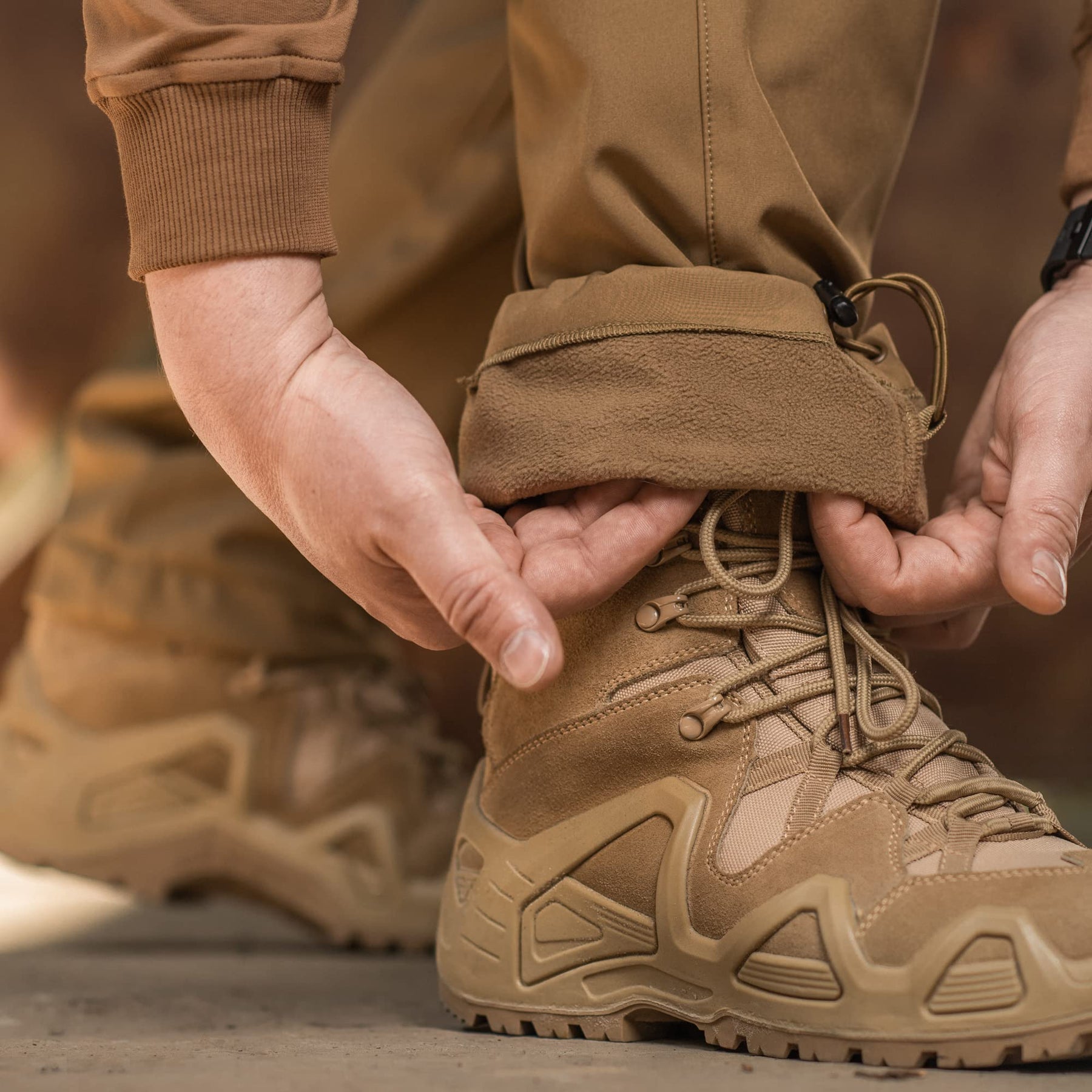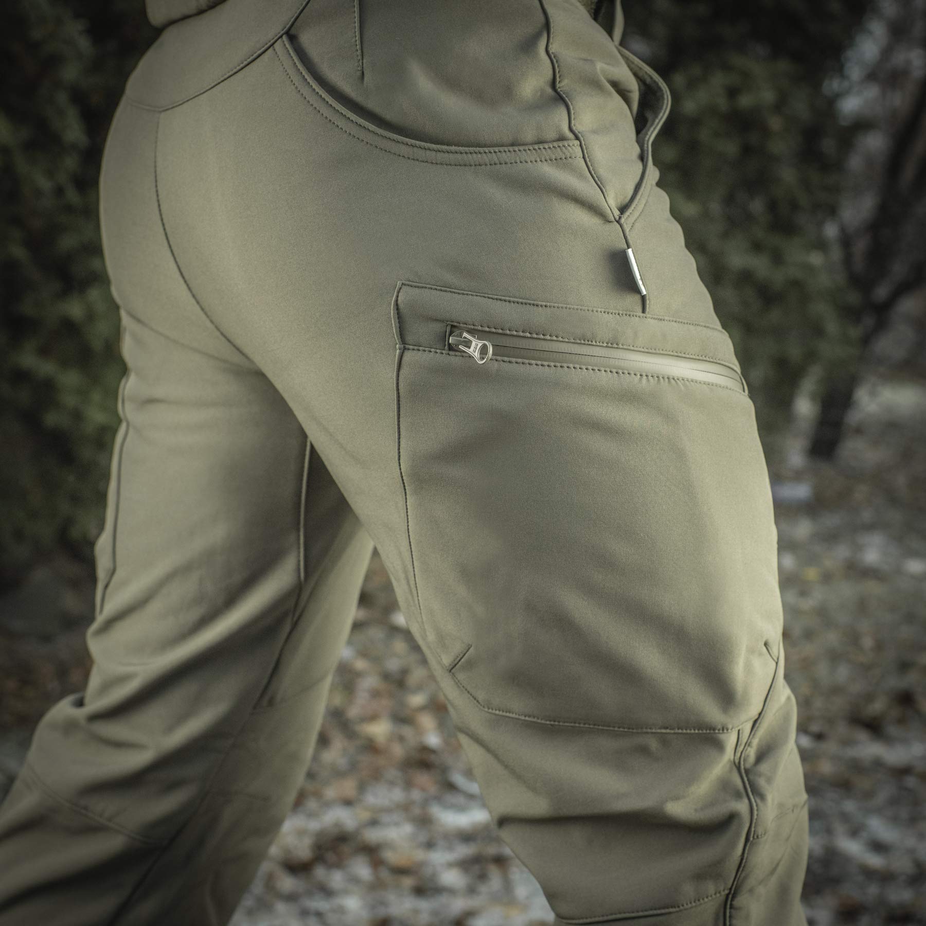 The M-Tac Soft Shell Winter tactical pants. The softshell fabric combines heat-insulating and "breathable" properties of fleece with wind and moisture resistance, strength of the outer layer. The outer surface blocks the wind, and the inner layer of the fabric wicks away excess moisture. It is used as a top layer in the off-season and in winter. For additional comfort in cold periods of the year, the manufacturer added a fleece lining.