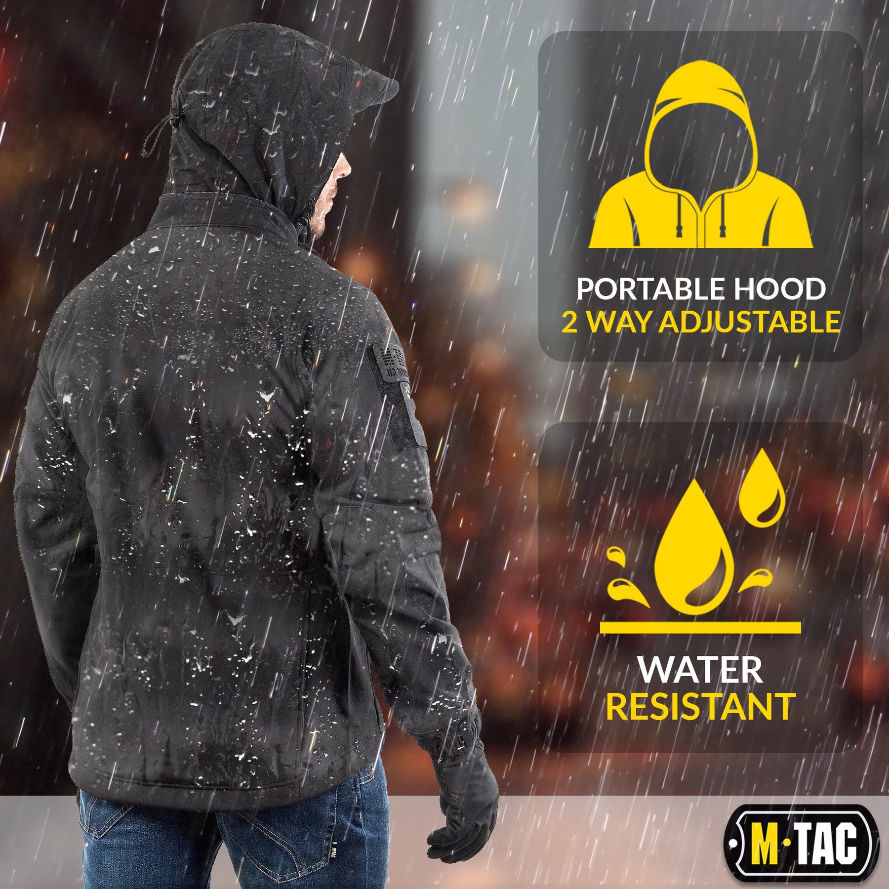 The M-TAC Soft Shell Jacket is made of an interlayer polyurethane membrane that protects from bad weather. Inside, it has a thin fleece. The softshell products have several outstanding properties: their low weight and the combination of two layers of clothing in one. The softshell combines an outer layer (for protection from wind and weather) and an insulating inner layer. The top fabric is not only moisture-deflecting but also dirt-deflecting as well. Besides, the soft and streamlined material makes it more comfortable to wear. The front zipper is made by YKK. The zipper has high quality and performs its function without any problems. Due to the presence of a number of pockets, it has increased functionality. Available two shoulder pockets, two inside pockets, two hand pockets, horizontal back pocket, forearm pocket. Axillary ventilation zippers improve thermoregulation. Elastic cord at the waist and adjustable wrist cuffs allow you to fit the jacket more comfortably on the body. And the compactly folded hood located at the back of the collar will always protect you from rain or snow. Side loop panels on the sleeves allows to wear various moral patches.